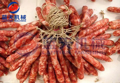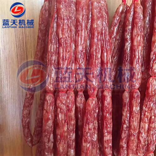 2、減速干燥階段。發色期和收縮定型期的控制,溫度控制在52℃~54℃,濕度控制在45%左右、時間為3到4個小時,臘腸逐漸從淺紅色轉為鮮紅色,腸衣開始收縮,這時一定要注意硬殼的出現,可以進行冷熱交替使用,效果更好。