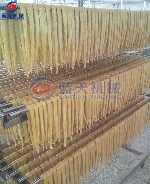 第三步——蒸煮抄條,將豆漿加熱時,表面出現一層膜,即可將豆漿膜掛至竹竿上(此步稱為抄條),竹竿掛滿后轉移至烘車上。抄條時高溫操作注意操作人員人身安全。
