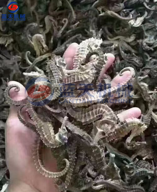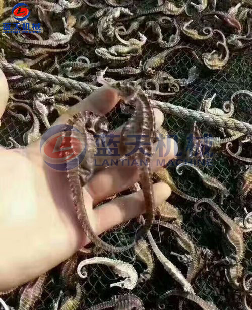加工時(shí).將海馬放在淡水中,清洗干凈,浸泡一段時(shí)間后,洗刷去體表灰黑色的皮膜,剖腹去掉內(nèi)臟,將尾盤卷起,將處理后的海馬平鋪在物料網(wǎng)格盤中,插入物料推車隔層,將裝滿新鮮海馬的物料車推入烘干房,關(guān)閉烘干房密封門。