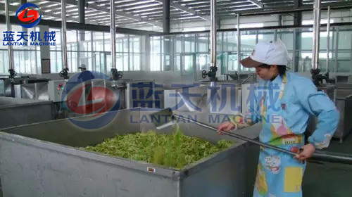 將洗干凈的原料根據產品要求分別切成片、絲、條等形狀。預煮時,因原料不同而異,易煮透的放沸水中焯熟,不易煮透的放沸水(水溫一般在150℃以上)中略煮片刻,一般燙漂時間為2~4分鐘。葉菜類最好不燙漂處理。