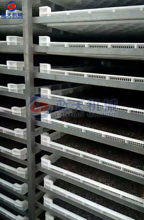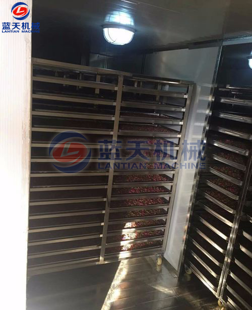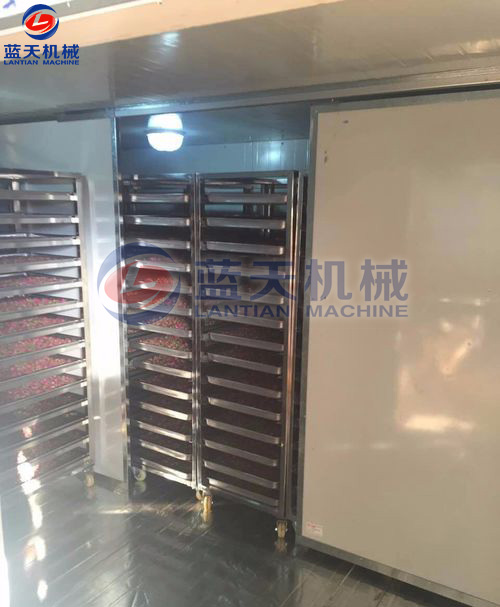 裝滿花蕾的物料車要輕輕推入烘干房,關閉烘干房室門升溫,嚴格控制室內溫度、依次順序溫度慢慢提升,采用循環風路,確?;ɡ俑蓾窬鶆?,色澤鮮艷。
