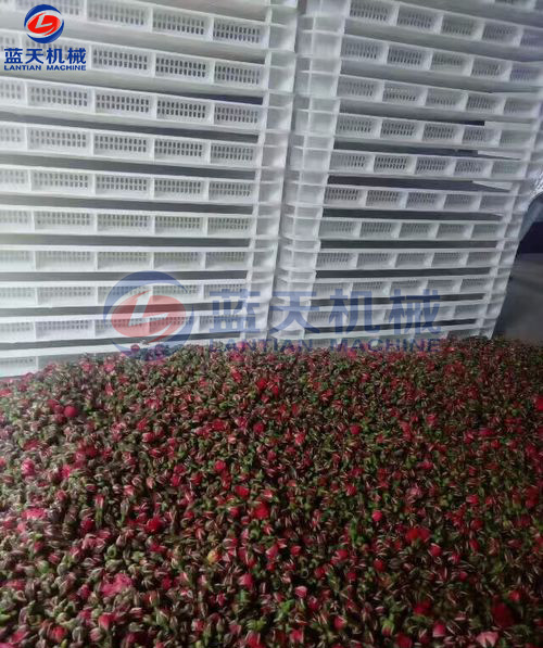 挑選后的鮮花蕾均勻的擺放在有鐵絲網底的網格盤內,花瓣統一向下或向上,厚度一致,勿擠壓;擺滿花蕾的網格盤裝車時要輕裝輕放,花蕾不能變形、磨損。
