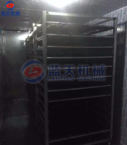 1)將木耳或云耳一層層均勻擺放至特氟龍材質的托盤后,放入不銹鋼物料車,推入木耳烘干房,木耳烘干時的溫度應從35℃開始,如果溫度過高,排濕跟不上,容易引起木耳變形。