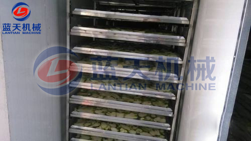 將切片好的佛手片放置于物料車托盤,注意堆放厚度不要超過3CM,這樣有助于烘房內(nèi)平流風(fēng)對(duì)整個(gè)物料的烘干效果保持一致性。