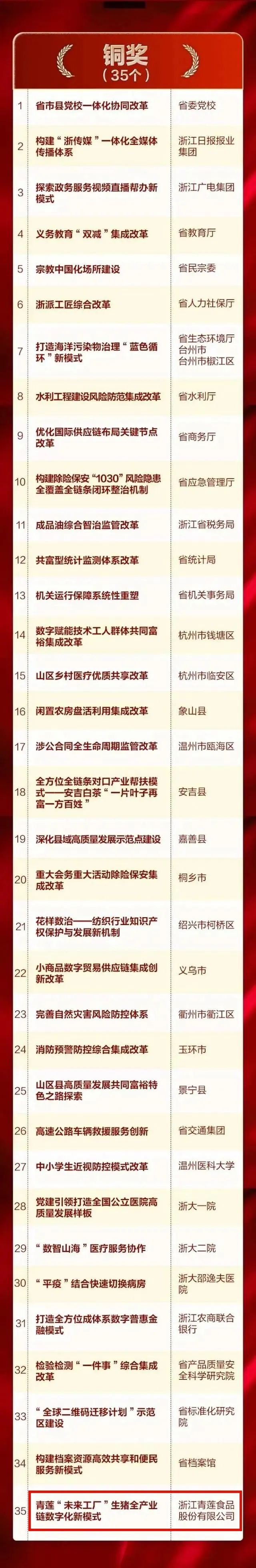 重磅!青蓮食品—膳博士榮獲浙江改革突破獎銅獎! 2023-02-02 08:37:26 浙江青蓮食品股份有限公司 瀏覽次數 7306 近日,浙江省委改革辦公布了2022年度浙江省改革突破獎名單。浙江青蓮食品股份有限公司“數智青蓮”未來工廠榮獲2022年度浙江省改革突破獎銅獎,是銅獎組中唯一的一家民營企業。20多年來,青蓮食品構建起從農場到餐桌的透明全產業鏈,在改革創新中以種業為源頭,建立起未來農場—未來工廠—產業新零售等數字化應用,真正從用戶需求出發為社會提供優質食品!此次獲得浙江改革突破獎銅獎,更是對青蓮食品數字化轉型成果的肯定和勉勵!實現黑豬專家膳博士在安全和美味雙升級上硬核突破!身為黑豬專家,膳博士服務過世博會、世乒賽、國際馬拉松比賽,連續8年為世界互聯網大會供肉,連續14年為中國極地研究中心供肉,成為杭州亞運會官方生鮮肉類產品供應商。以國家級嘉興黑豬和兩頭烏保種場作為種業基礎繁育國家級優質新品種,形成完整的黑豬商品體系為消費者帶來舌尖體驗。近年來,通過智慧養殖為傳統畜牧產業數字化轉型先行探路,以新一代信息技術為手段,重塑生豬全產業鏈生產組織方式和管理服務模式,構建“1+4+N”模型,推動全產業鏈數字化轉型。產業零售端以用戶需求為中心持續推出膳博士黑豬鮮肉鮮制系列產品提升消費體驗,滿足國人對美好生活、品質食品的向往。2022年,青蓮智慧牧場首批入選浙江省“未來農場”,“數智青蓮”未來工廠獲全省數字化改革“最佳應用”和全省數字經濟系統“最佳應用”。在全省數字化改革大會上做匯報演示,列入全省數字經濟系統地方特色應用目錄,受到央視、省級、市縣級等媒體持續關注報道。 上一條“風云浙商”許明曙:人生把一件事做好就很不容易 下一條全國唯一!膳博士·香雪白豬獲2022年度國家新品種認定!