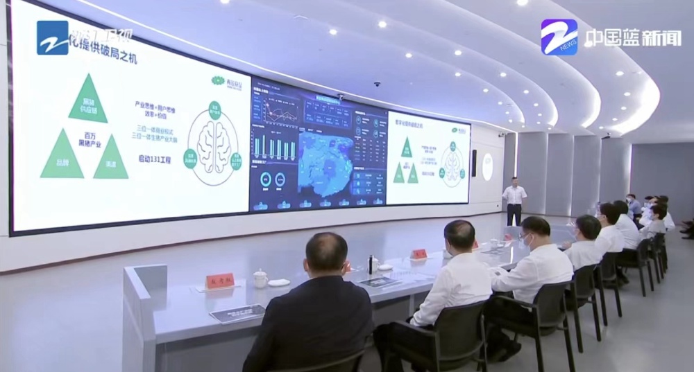 青蓮食品董事長許明曙向袁書記詳細匯報了青蓮整體發展,重點介紹了以數字賦能打造生豬全產業鏈,建設數字戰略指揮中心,自建數字化渠道,從產品形成到消費全過程直接擁抱客戶。在青蓮云上牧場方面,與浙江大學合作建立中國首個黑豬產業研究院,從黑豬營養到育種,借助大數據建立起柔性協同生產體系;